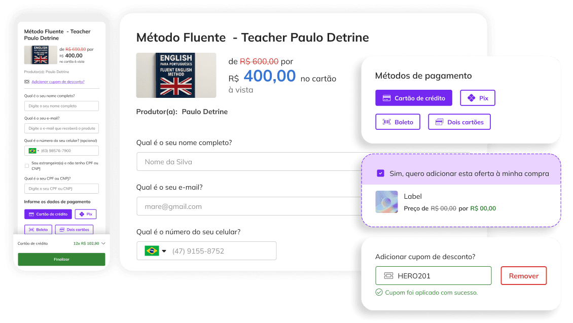 Nosso checkout oferece tudo que você precisa para vender mais rápido, de forma segura e personalizável. Aceite diversos meios de pagamento, crie ofertas com links e cupons, gerencie assinaturas e acompanhe resultados em relatórios completos.
